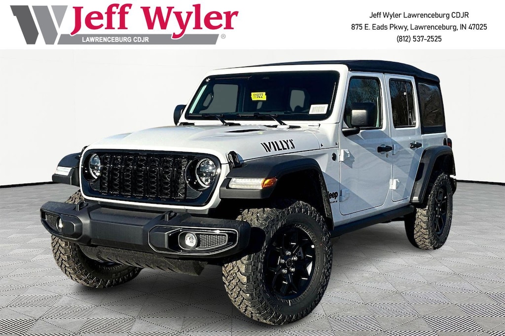 Jeff Wyler Chrysler Dodge Jeep of Lawrenceburg is delighted to offer this outstanding-looking and fun 2026 Jeep Wrangler Willys in bright white clearcoat. Well equipped with: Quick Order Package 24W Willys (4-Wheel Drive Swing Gate Decal, 7 and 4 Pin Wiring Harness, Advanced Brake Assist, Automatic Headlamps, Auxiliary Switches, Black Grille with Gloss Black Rings, Class II Receiver Hitch, Conventional Differential Front Axle, Corning Gorilla Glass, Dana M210 Wide HD Tube Front Axle, Dana M220 Wide Rear Axle, Daytime Running Lamps LED Accents, Deep Tint Sunscreen Windows, E-Locker Rear Axle, Enhanced Adaptive Cruise Control, Front LED Fog Lamps, Full Speed Forward Collision Warning Plus, Increased Travel Export Tuned Suspension, Injection Molded Black Rear Bumper, LED Premium Reflector Headlamps, Mold in Color Bumper with Gloss Black, Molded in Color Rubicon Highline Flare, MOPAR All-Weather Floor Mats, Off-Road Plus Mode, Power Heated Mirrors, Premium Wrapped Steering Wheel, Security Alarm, Sun Visors with Illuminated Vanity Mirrors, Wheels: 17" x 7.5" Painted Black, and Willys Hood Decal), Steel Power Dome Hood Package (Power Dome Dual Vented Hood), 12.3" Touchscreen Display, 4-Wheel Disc Brakes, 4G LTE Wi-Fi Hot Spot, 8 Speakers, ABS brakes, Air Conditioning, AM/FM radio: SiriusXM with 360L, Apple CarPlay, Apple CarPlay/Android Auto, Aux Battery, Brake assist, Compass, Connectivity - US/Canada, Delay-off headlights, Driver door bin, Driver vanity mirror, Dual front impact airbags, Dual front side impact airbags, Electronic Stability Control, For More Info, Call 800-643-2112, Front anti-roll bar, Front Bucket Seats, Front Center Armrest w/Storage, Front fog lights, Front reading lights, Google Android Auto, Illuminated entry, Integrated Center Stack Radio, Integrated roll-over protection, Low tire pressure warning, Non-Lock Fuel Cap Without Discriminator, Normal Duty Suspension, Occupant sensing airbag, Outside temperature display, Overhead airbag, Panic alarm, ParkView Rear Back-Up Camera, Passenger door bin, Passenger vanity mirror, Power steering, Power windows, Radio data system, Radio: Uconnect 5 with 12.3" Display, Rear anti-roll bar, Rear reading lights, Remote keyless entry, SiriusXM Radio Service, SiriusXM with 360L, Speed control, Split folding rear seat, Steering wheel mounted audio controls, Stop-Start Dual Battery System, Tachometer, Telescoping steering wheel, Tilt steering wheel, Traction control, Trip computer, Variably intermittent wipers, and Wheels: 17" x 7.5" Black Steel Styled.Wyler Family First Package Includes: NanoCure Appearance Protection: Exterior & Interior Chemical Sealant Applied to Protect Against Environmental Hazards (7 Year Warranty Coverage). Pulse- Rear end Collision Avoidance System Theft Deterrent Strategy gives you 5 Years of Coverage against vehicle Theft, Offering up to a $5,000 benefit. Used vehicles 10 years of age or newer with less than 100,000 miles are eligible for the Wyler Assurance Program, but eligible vehicles must pass our reconditioning process and multi-point inspection. Provided the vehicle passes inspection, vehicles will be eligible for the 6 month/6,000 mile limited warranty. The 6 month/6,000 mile limited warranty is NOT available on AS-IS vehicles, wholesale vehicles, lease buyback/pass-thru vehicles or un-inspected vehicles. Note that this program can also apply to vehicles where the remaining factory coverage is less than 6 months or 6,000 miles. Please check the Federal Trade Commission (FTC) Buyers guide on the vehicle for full details as to whether or not warranty coverage may apply. Contact Dealer for additional details.The Wyler Assurance 6 month/6,000 Mile limited warranty ends 6 months from the date of the Retail Purchase Agreement (BUYERS ORDER) or when the vehicle's odometer registers 6,000 additional miles to the mileage listed on the BUYERS ORDER, whichever comes first. You Price includes: $1000 - 2026 National Retail Bonus Cash . Exp. 04/30/2026