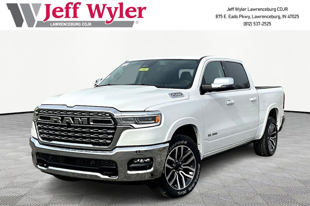 Jeff Wyler Chrysler Dodge Jeep of Lawrenceburg is very proud to offer this superb 2026 Ram 1500 Limited in Bright White Clearcoat. Well equipped with: Quick Order Package 22K Longhorn (Grille Surround 4 Chrome Texture 5 Chrome, Longhorn Badge, Longhorn Instrument Cluster Theme 3, Premium Door Trim Panel, Premium Filigree Leather Seats, and Warm Chrome Key Fob), 19 Speakers, 3.92 Rear Axle Ratio, 4-Wheel Disc Brakes, 4G LTE Wi-Fi Hot Spot, ABS brakes, Active Noise Control System, Adjustable pedals, Air Conditioning, Alloy wheels, AM/FM radio, Apple CarPlay, Apple CarPlay/Android Auto, Audio memory, Auto High-beam Headlights, Auto Power-Folding Mirrors, Auto-dimming door mirrors, Auto-Dimming Exterior Driver Mirror, Auto-dimming Rear-View mirror, Auto-leveling suspension, Automatic temperature control, Bodyside moldings, Brake assist, Bumpers: chrome, Chrome Exterior Mirrors, Compass, Connected Travel and Traffic Services, Connectivity - US/Canada, Convex Wide-Angle Exterior Mirror Insert, Delay-off headlights, Disassociated Touchscreen Display, Driver door bin, Driver vanity mirror, Dual front impact airbags, Dual front side impact airbags, Electronic Stability Control, Exterior Mirrors Courtesy Lamps, Exterior Mirrors with Heating Element, Exterior Mirrors with Memory, Exterior Mirrors with Supplemental Signals, Exterior Parking Camera Rear, Front anti-roll bar, Front Bucket Seats, Front Center Armrest w/Storage, Front dual zone A/C, Front fog lights, Front reading lights, Front wheel independent suspension, Fully automatic headlights, Garage door transmitter, Genuine wood console insert, Genuine wood dashboard insert, Genuine wood door panel insert, Global Telematics Box Module, Google Android Auto, GPS Antenna Input, GPS Navigation, harman/kardon® Speakers, HD Radio, Heated door mirrors, Heated front seats, Heated rear seats, Heated steering wheel, Illuminated entry, Integrated Center Stack Radio, Integrated Voice Command with Bluetooth, Leather steering wheel, Low tire pressure warning, Memory seat, Multi-Function Tailgate, Navigation System, Occupant sensing airbag, Outside temperature display, Overhead airbag, Overhead console, Panic alarm, Passenger door bin, Passenger vanity mirror, Pedal memory, Power door mirrors, Power driver seat, Power passenger seat, Power steering, Power windows, Premium Quilted Leather Bucket Seats, Radio data system, Radio: Uconnect 5 Navigation with 12.0" Display, Rain sensing wipers, RAM's Head Badge, Rear anti-roll bar, Rear reading lights, Rear seat center armrest, Rear step bumper, Rear window defroster, Remote keyless entry, Remote Tailgate Release, Security system, SiriusXM Radio Service, SiriusXM with 360L, Speed control, Split folding rear seat, Steering wheel mounted audio controls, Tachometer, Telescoping steering wheel, Tilt steering wheel, Traction control, Trailer Brake Control, Trip computer, Turn signal indicator mirrors, USB Host Flip, Variably intermittent wipers, Ventilated front seats, Ventilated rear seats, Voltmeter, and Wheels: 20" x 9" Premium Paint/Polished.Wyler Family First Package Includes: NanoCure Appearance Protection: Exterior & Interior Chemical Sealant Applied to Protect Against Environmental Hazards (7 Year Warranty Coverage). Pulse- Rear end Collision Avoidance System Theft Deterrent Strategy gives you 5 Years of Coverage against vehicle Theft, Offering up to a $5,000 benefit. Used vehicles 10 years of age or newer with less than 100,000 miles are eligible for the Wyler Assurance Program, but eligible vehicles must pass our reconditioning process and multi-point inspection. Provided the vehicle passes inspection, vehicles will be eligible for the 6 month/6,000 mile limited warranty. The 6 month/6,000 mile limited warranty is NOT available on AS-IS vehicles, wholesale vehicles, lease buyback/pass-thru vehicles or un-inspected vehicles. Note that this program can also apply to vehi Price includes: $3500 - 2026 National Retail Bonus Cash . Exp. 04/30/2026