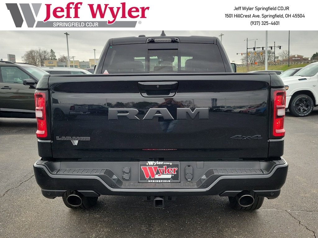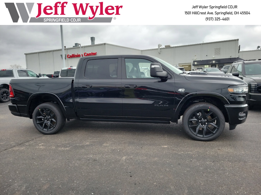 Jeff Wyler Springfield Auto Mall is pumped up to offer this fantastic 2026 Ram 1500 Laramie in Diamond Black Crystal Pearlcoat. Well equipped with: Advanced Safety Group II (12-Way/1-Way Trailer Connector, Active Driving Assist System, Drowsy Driver Detection, Evasive Steer Assist, Exterior Mirrors Approach Lamps, Intersection Collision Assist System, Surround View Camera System, and Traffic Sign Recognition), Laramie Level 2 Equipment Group (14.4" Touchscreen Display, 4G LTE Wi-Fi Hot Spot, Cluster 12" TFT Color Display, Connected Travel and Traffic Services, Connectivity - US/Canada, Front Passenger Interactive Display, GPS Navigation, Harman/Kardon 19 Speaker Premium Sound, Integrated Center Stack Radio, Integrated Voice Command with Bluetooth, Power Tailgate, Radio: Uconnect 5 Nav with 14.4" Display, Rain Sensitive Windshield Wipers, SiriusXM Radio Service, SiriusXM with 360L, and USB Host Flip), Night Edition (Accent Color Door Handles, Accent Color Premium Power Mirrors, Accent Color Tailgate Handle, Anti-Spin Differential Rear Axle, Auto Power-Folding Mirrors, Auto-Dimming Exterior Driver Mirror, Black Exterior Truck Badging, Black Headlamp Bezels, Black Interior Accents, Black Painted Exterior Mirrors Caps, Black Tail Lamp Bezels, Body Color Front Bumper, Body Color Rear Bumper with Step Pads, Convex Wide-Angle Exterior Mirror Insert, Dual Exhaust with Black Tips, Exterior Mirrors Courtesy Lamps, Exterior Mirrors with Heating Element, Exterior Mirrors with Memory, Exterior Mirrors with Supplemental Signals, Grille Surround 3 Black Texture 2 Black, Pirelli Brand Tires, Proximity Approach/Departure Lamps, RAM Grille Badge - Black, Sport Performance Hood, and Wheels: 22" x 9" Forged Aluminum), Quick Order Package 27H Laramie, Technology Group (Heads-Up Display and LED CHMSL Lamp), Towing Technology Group (Trailer Hitch Line-Up Assist), Trailer Tow Group (Trailer Brake Control, Trailer Reverse Steering Control, and Trailer Tire Pressure Monitoring System), 10 Speakers, 240 Amp Alternator, 4-Wheel Disc Brakes, ABS brakes, Active Noise Control System, Adjustable pedals, Air Conditioning, Alloy wheels, AM/FM radio: SiriusXM with 360L, Apple CarPlay/Android Auto, Audio memory, Auto High-beam Headlights, Auto-dimming door mirrors, Auto-Dimming Exterior Passenger Mirror, Auto-dimming Rear-View mirror, Automatic temperature control, Black Exterior Mirrors, Black Power-Fold Trailer Tow Mirrors, Brake assist, Bumpers: chrome, Chrome Exterior Mirrors, Compass, Delay-off headlights, Dome Dual LED Reading Lamp, Driver door bin, Driver vanity mirror, Dual front impact airbags, Dual front side impact airbags, Dual-Pane Panoramic Sunroof, E-Locker Rear Axle, Electronic Stability Control, Engine Block Heater, Forward and Reverse Utility Lights, Front anti-roll bar, Front Bucket Seats, Front Center Armrest w/Storage, Front dual zone A/C, Front fog lights, Front License Plate Bracket, Front reading lights, Front wheel independent suspension, Fully automatic headlights, Garage door transmitter, Hands-Free Active Driving Assist System, Heated door mirrors, Heated front seats, Heated rear seats, Heated steering wheel, Illuminated entry, Leather steering wheel, Leather Trimmed Bucket Seats, LED Dome/Reading Lamp, Low tire pressure warning, Memory seat, Mirror Clearance/Running Lights, Navigation System, Occupant sensing airbag, Off-Road Information Pages, Outside temperature display, Overhead airbag, Overhead console, Panic alarm, ParkView Rear Back-Up Camera, Passenger door bin, Passenger vanity mirror, Pedal memory, Power Deployable Running Boards, Power door mirrors, Power driver seat, Power passenger seat, Power steering, Power Telescoping Mirrors, Power windows, Power-Adjustable Convex Aux Mirrors, Radio data system, Radio: Uconnect 5 Navigation with 12.0" Display, RAM Grille Badge - Chrome, Rear anti-r Available Incentives: $3500 - 2026 National Retail Bonus Cash . Exp. 04/30/2026 $500 - 2026 Great Lakes BC Bonus Cash . Exp. 04/30/2026