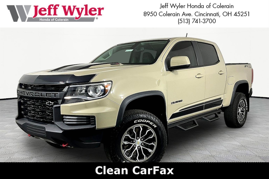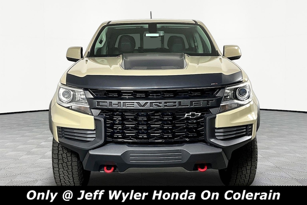 Jeff Wyler Honda of Colerain is excited to offer this charming 2022 Chevrolet Colorado ZR2 in Sand Dune Metallic. Well equipped with: Door Decal Package (LPO), Heavy-Duty Trailering Package, Preferred Equipment Group 4ZR (Black Rear Bumpers, Black Spray-On Bedliner w/Chevrolet Logo, Driver-Selectable Full-Locking Front Differential, Driver-Selectable Full-Locking Rear Differential, Hitch Guidance, Integrated Trailer Brake Controller, and Tow/Haul Mode), ZR2 Off-Road Package, 2 USB Data Ports w/SD Card Reader, 3.42 Rear Axle Ratio, 4-Way Power Front Passenger Seat Adjuster, 4-Wheel Disc Brakes, 6 Speakers, 6-Speaker Audio System Feature, ABS brakes, Air Conditioning, Alloy wheels, AM/FM radio: SiriusXM, Apple CarPlay/Android Auto, Auto-dimming Rear-View mirror, Automatic temperature control, Black Body Side Moldings (LPO), Black Tailgate CHEVROLET Lettering (LPO), Bose Premium 7-Speaker Audio System Feature, Compass, Delay-off headlights, Driver 6-Way Power Seat Adjuster, Driver door bin, Driver vanity mirror, Dual front impact airbags, Dual front side impact airbags, Electronic Stability Control, Engine Block Heater, Exhaust Brake, Exterior Parking Camera Rear, Front anti-roll bar, Front Bucket Seats, Front Center Armrest, Front reading lights, Front wheel independent suspension, Fully automatic headlights, HD Radio, Heated door mirrors, Heated steering wheel, Illuminated entry, Leather-Appointed Seat Trim, Low tire pressure warning, Occupant sensing airbag, Outside temperature display, Overhead airbag, Overhead console, Panic alarm, Passenger door bin, Passenger vanity mirror, Power door mirrors, Power Driver Lumbar Control Seat Adjuster, Power driver seat, Power Passenger Lumbar Control Seat Adjuster, Power passenger seat, Power steering, Power windows, Premium audio system: Chevrolet Infotainment 3 Plus, Radio data system, Radio: Chevrolet Infotainment 3 Plus System, Radio: Chevrolet Infotainment 3 Plus System w/Navi, Rear reading lights, Rear seat center armrest, Rear step bumper, Rear window defroster, Remote keyless entry, Security system, SiriusXM Radio, Speed control, Speed-sensing steering, Steering wheel mounted audio controls, Tachometer, Telescoping steering wheel, Tilt steering wheel, Traction control, Trip computer, Variably intermittent wipers, Wheels: 17" x 8" Graphite & Oxide Gold Aluminum, and Wireless Charging for Compatible Cell Phones.