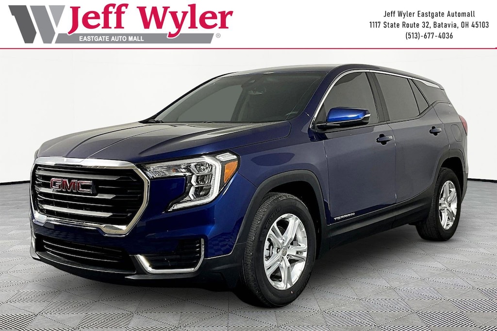 Jeff Wyler Eastgate Auto Mall is pumped up to offer this beautiful 2022 GMC Terrain SLE in Marine Metallic. Well equipped with: GMC Pro Safety Plus (Adaptive Cruise Control, Lane Change Alert w/Side Blind Zone Alert, Outside Heated Power-Adjustable Mirrors, Rear Cross-Traffic Alert, Rear Park Assist, and Safety Alert Seat), Preferred Equipment Group 3SA, 2 USB Data Ports w/Auxiliary Input Jack, 3.47 Axle Ratio, 4-Way Manual Driver's Seat, 4-Way Manual Front Passenger Seat, 4-Wheel Disc Brakes, 4.2" Multi-Color Driver Information Screen, 6 Speakers, 6-Speaker Audio System Feature, ABS brakes, Air Conditioning, Alloy wheels, AM/FM radio: SiriusXM, Auto High-beam Headlights, Auto-dimming Rear-View mirror, Automatic temperature control, Bluetooth® For Phone, Brake assist, Bumpers: body-color, Compass, Delay-off headlights, Driver door bin, Driver vanity mirror, Dual front impact airbags, Dual front side impact airbags, Electronic Stability Control, Emergency communication system: OnStar Guidance, Four wheel independent suspension, Front anti-roll bar, Front Bucket Seats, Front Center Armrest, Front reading lights, Fully automatic headlights, Heated door mirrors, Illuminated entry, Low tire pressure warning, Occupant sensing airbag, Outside temperature display, Overhead airbag, Overhead console, Panic alarm, Passenger door bin, Passenger vanity mirror, Power door mirrors, Power steering, Power windows, Premium Cloth Seat Trim, Radio data system, Radio: GMC Infotainment Audio System w/7" Display, Rear anti-roll bar, Rear seat center armrest, Rear window defroster, Rear window wiper, Remote keyless entry, Security system, SiriusXM Radio, Speed control, Speed-sensing steering, Split folding rear seat, Spoiler, Steering wheel mounted audio controls, Tachometer, Telescoping steering wheel, Tilt steering wheel, Traction control, Trip computer, Variably intermittent wipers, Wheels: 17" x 7" Silver Painted Aluminum, and Wireless Apple CarPlay/Wireless Android Auto. CARFAX One-Owner. Ask about available certifications. Used vehicles 10 years of age or newer with less than 100,000 miles are eligible for the Wyler Assurance Program, but eligible vehicles must pass our reconditioning process and multi-point inspection. Provided the vehicle passes inspection, vehicles will be eligible for the 6 month/6,000 mile limited warranty. The 6 month/6,000 mile limited warranty is NOT available on AS-IS vehicles, wholesale vehicles, lease buyback/pass-thru vehicles or un-inspected vehicles. Note that this program can also apply to vehicles where the remaining factory coverage is less than 6 months or 6,000 miles. Please check the Federal Trade Commission (FTC) Buyers guide on the vehicle for full details as to whether or not warranty coverage may apply. Contact Dealer for additional details. The Wyler Assurance 6 month/6,000 Mile limited warranty ends 6 months from the date of the Retail Purchase Agreement (BUYERS ORDER) or when the vehicle's odometer registers 6,000 additional miles to the mileage listed on the BUYERS ORDER, whichever comes first. Your Deductible - The warranty holder on your contract pays the first $100 of each covered repair.