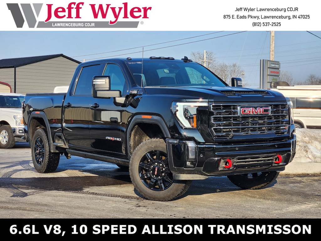 Jeff Wyler Chrysler Dodge Jeep of Lawrenceburg is pumped up to offer this stunning 2024 GMC Sierra 2500HD AT4 in Onyx Black. AT4 Preferred Package (Adaptive Cruise Control, LED Smoked Amber Roof Marker Lamps, Power Sliding Rear Window w/Defogger, and Universal Home Remote), AT4 Premium Plus Package (Off-Road High Clearance Step (LPO) and Power Sunroof), Gooseneck/5th Wheel Prep Package, Heavy Duty Front Spring/Camper Package, Hitch Package (LPO), Preferred Equipment Group 4SB (120-Volt Bed Mounted Power Outlet, 120-Volt Instrument Panel Power Outlet, 2 Charge-Only Rear USB Ports, 2 Charge/Data USB Ports Inside Center Console, 2 USB Ports, 2-Speed Active Transfer Case, Bed View Camera w/2 Trailer Camera Provisions, Bose Premium 7-Speaker Sound System, Deep-Tinted Glass, Electric Rear-Window Defogger, Floor-Mounted Center Console, Front Prem Floor Liners w/Removable Carpet Insert, Front Rain-Sensing Wipers, Gloss Black Header Grille & Grille Insert Bars, GMC Connected Access Capable, HD Surround Vision, Heated 2nd Row Outboard Seats, Heated Driver & Front Outboard Passenger Seats, Integrated Trailer Brake Controller, Keyless Open & Start, LED Cargo Area Lighting, Manual Tilt-Wheel/Telescoping Steering Column, OnStar & GMC Connected Services Capable, Power Front Passenger Windows w/Express Up/Down, Push Button Start, Rear Cross Traffic Alert, Rear Prem Floor Liners w/Removable Carpet Insert, Rear Wheelhouse Liners, Remote Vehicle Starter System, Safety Alert Seat, SiriusXM w/360L, Spray-On Bedliner w/AT4 Logo, Steering Wheel Audio Controls, Trailer Cam Provisions & Trailer Viewing Software, Trailer Side Blind Zone Alert, Ultrasonic Front & Rear Park Assist, Unauthorized Entry Theft-Deterrent System, Ventilated Driver & Front Passenger Seats, Wireless Charging, and Wireless Phone Projection), Technology Package (Inside Rearview Auto-Dimming Rear Camera Mirror and Multicolor 15" Diagonal Head-Up Display), X31 Off-Road Package (Hill Descent Control), 10-Speed Automatic, 4WD, Jet Black With Kalahari Accents Leather, 10-Way Power Driver Seat Adjuster w/Lumbar, 10-Way Power Passenger Seat Adjuster w/Lumbar, 220-Amp Alternator, 3.73 Rear Axle Ratio, 4-Wheel Disc Brakes, 7 Speakers, ABS brakes, Air Conditioning, Alloy wheels, AM/FM radio: SiriusXM with 360L, Apple CarPlay/Android Auto, Auto High-beam Headlights, Auto-dimming door mirrors, Auto-dimming Rear-View mirror, Automatic Emergency Braking, Automatic temperature control, Brake assist, Buckle to Drive, Bumpers: body-color, Compass, Delay-off headlights, Driver door bin, Driver Memory, Driver vanity mirror, Dual front impact airbags, Dual front side impact airbags, Electronic Stability Control, Following Distance Indicator, Forward Collision Alert, Front anti-roll bar, Front Bucket Seats, Front Center Armrest, Front dual zone A/C, Front fog lights, Front Pedestrian Braking, Front reading lights, Front wheel independent suspension, Fully automatic headlights, Heated door mirrors, Heated front seats, Heated rear seats, Heated steering wheel, Heavy-Duty 80 Amp Battery, Hitch Guidance w/Hitch View, Illuminated entry, In-Vehicle Trailering System App, IntelliBeam Automatic High Beam On/Off, Lane Departure Warning System, Low tire pressure warning, Memory seat, Occupant sensing airbag, Off-Road Suspension, Outside temperature display, Overhead airbag, Overhead console, Panic alarm, Passenger door bin, Passenger vanity mirror, Perforated Leather-Appointed Front Seat Trim, Pickup Box, Power door mirrors, Power driver seat, Power passenger seat, Power steering, Power windows, Power-Retractable Black Assist Steps, Premium audio system: Premium GMC Infotainment System, Radio: AM/FM w/Premium GMC Infotainment System, Rain sensing wipers, Rear reading lights, Rear seat center armrest, Rear step bumper, Rear Underseat Storage (LPO), Rear window defroster, Remote keyless entry, Security system, Speed control, Speed-sensing steering, Split folding rear seat, Steering wheel mounted audio controls, T