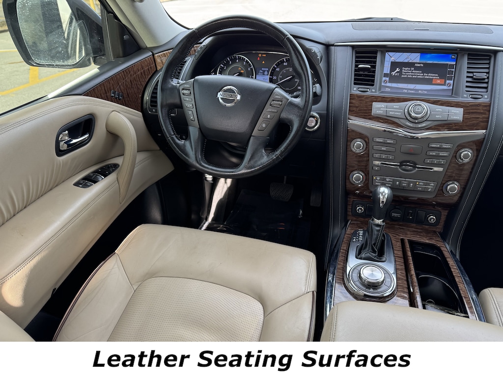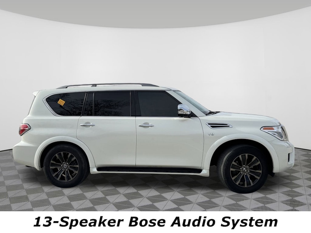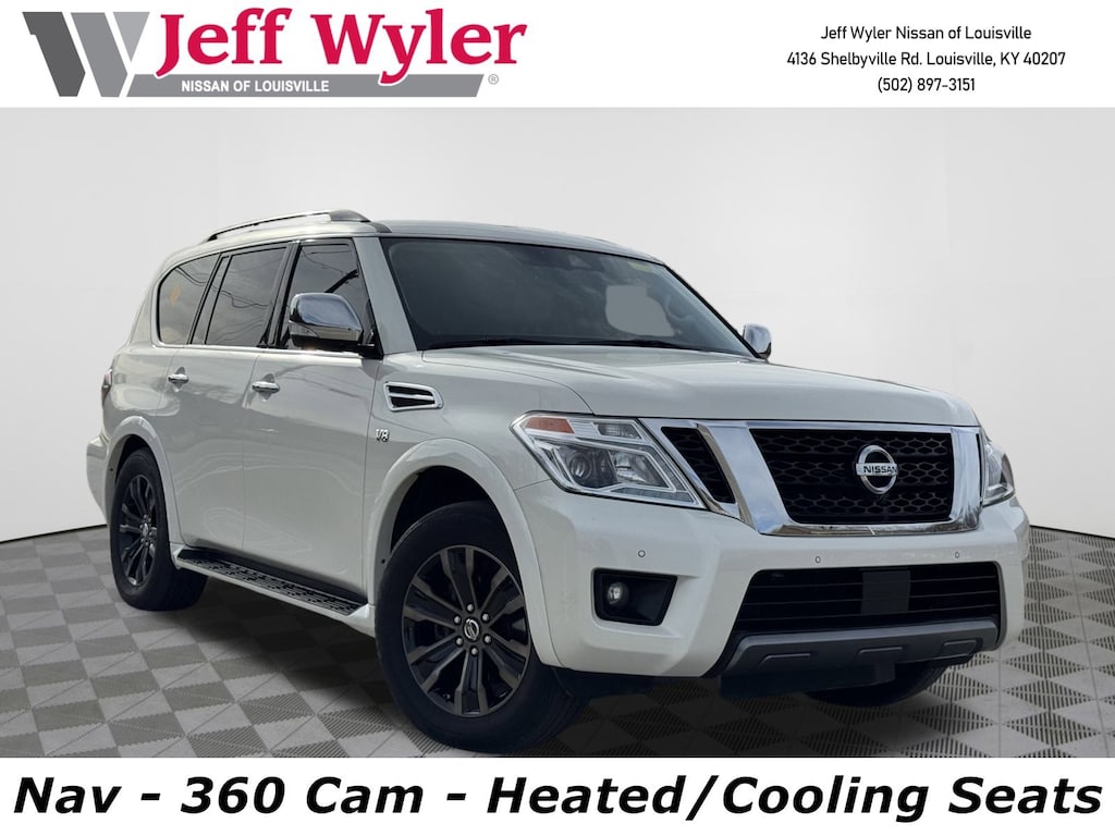 Jeff Wyler Nissan of Louisville is excited to offer this beautiful 2019 Nissan Armada Platinum in Pearl White Tricoat. ** ALL WHEEL DRIVE/AWD **, ** CLEAN CARFAX REPORT **, ** BLUETOOTH **, ** NAVIGATION **, ** BACKUP CAMERA **, ** THIRD ROW SEATING **, ** LEATHER INTERIOR **, ** HEATED SEATS **, ** PUSH-BUTTON START **, ** EXCELLENT SERVICE HISTORY **, ** LOCALLY OWNED **, and ** HOME DELIVERY OPTIONS! ** Captain's Chairs Package (2nd Row Captain's Chairs and 2nd Row Center Console w/ Padded Armrest), Carpeted Floor Mats w/ Captain Seat Package, 4WD, Navigation System, 13 Speakers, 2.937 Axle Ratio, 3rd row seats: split-bench, 4-Wheel Disc Brakes, A/V remote, ABS brakes, Air Conditioning, Alloy wheels, AM/FM radio: SiriusXM, Anti-whiplash front head restraints, Auto tilt-away steering wheel, Auto-dimming door mirrors, Auto-dimming Rear-View mirror, Auto-leveling suspension, Automatic temperature control, Brake assist, Bumpers: body-color, CD player, Delay-off headlights, Driver door bin, Driver vanity mirror, Dual front impact airbags, Dual front side impact airbags, Electronic Stability Control, Emergency communication system: NissanConnect Services, Four wheel independent suspension, Front anti-roll bar, Front Bucket Seats, Front Center Armrest, Front dual zone A/C, Front fog lights, Front reading lights, Fully automatic headlights, Garage door transmitter: HomeLink, Headphones, Heated & Cooled Front Bucket Seats w/Driver Memory, Heated door mirrors, Heated front seats, Heated rear seats, Heated steering wheel, Illuminated entry, Leather Shift Knob, Leather-Appointed Seat Trim, Low tire pressure warning, Memory seat, Occupant sensing airbag, Outside temperature display, Overhead airbag, Overhead console, Panic alarm, Passenger door bin, Passenger vanity mirror, Power door mirrors, Power driver seat, Power Liftgate, Power moonroof, Power passenger seat, Power steering, Power windows, Radio data system, Radio: AM/FM/SXM/CD/MP3/HD, Rain sensing wipers, Rear air conditioning, Rear anti-roll bar, Rear reading lights, Rear seat center armrest, Rear window defroster, Rear window wiper, Reclining 3rd row seat, Remote keyless entry, Roof rack: rails only, Security system, Special Paint - Pearl White, Speed control, Speed-sensing steering, Speed-Sensitive Wipers, Split folding rear seat, Spoiler, Steering wheel memory, Steering wheel mounted audio controls, Tachometer, Telescoping steering wheel, Tilt steering wheel, Traction control, Trip computer, Turn signal indicator mirrors, Variably intermittent wipers, Ventilated front seats, Voltmeter, and Wheels: 20" Machine-Faced Chrome w/Tinted CC Our PRE-OWNED vehicles are put through a rigorous 167- POINT QUALITY ASSURANCE INSPECTION along with an average amount of over $1,400.00 SPENT to recondition each vehicle so we can be sure to deliver you the highest quality vehicle like you deserve! ***ONLINE PRICE DOES NOT INCLUDE WYLER FAMILY FIRST PACKAGE*** Stop by 4136 Shelbyville Road to see for yourself, or give us a call @ 502-897-3151 to schedule your test drive! ** ALL WHEEL DRIVE/AWD **, ** CLEAN CARFAX REPORT **, ** BLUETOOTH **, ** NAVIGATION **, ** BACKUP CAMERA **, ** THIRD ROW SEATING **, ** LEATHER INTERIOR **, ** HEATED SEATS **, ** PUSH-BUTTON START **, ** EXCELLENT SERVICE HISTORY **, ** LOCALLY OWNED **, 4WD, 2nd Row Captain's Chairs, 2nd Row Center Console w/ Padded Armrest, Captain's Chairs Package, Carpeted Floor Mats w/ Captain Seat Package, Navigation System.