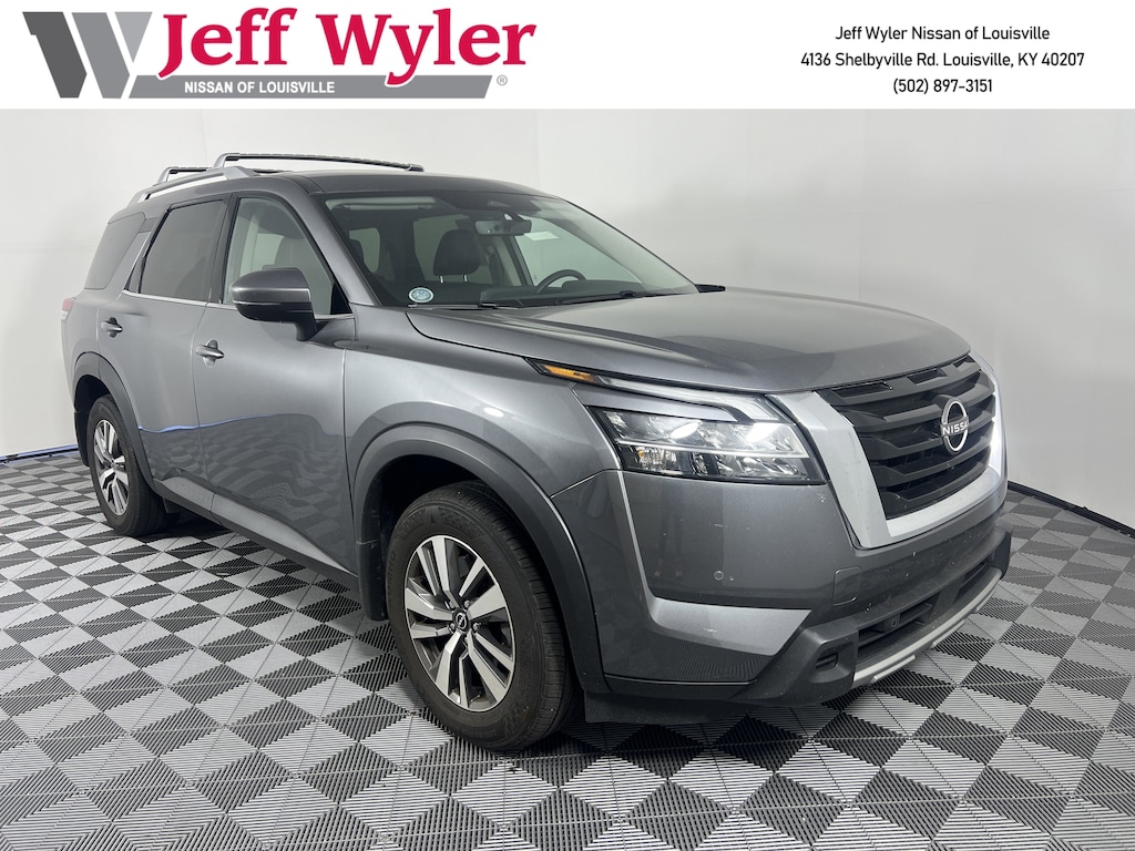 Jeff Wyler Nissan of Louisville is honored to offer this fantastic-looking 2024 Nissan Pathfinder SL in Gun Metallic. ** HOME DELIVERY OPTIONS! ** 4WD, 3rd row seats: bench, 4-Wheel Disc Brakes, 6 Speakers, ABS brakes, Air Conditioning, Alloy wheels, AM/FM radio: SiriusXM, Auto High-beam Headlights, Auto-dimming Rear-View mirror, Automatic temperature control, Axle Ratio: 4.334, Bench Seat Carpeted Floor Mats (Set of 4), Black Splash Guards (Set of 4), Bose Premium Audio System, Brake assist, Bumpers: body-color, Cross Bars, Delay-off headlights, Driver door bin, Driver vanity mirror, Dual front impact airbags, Dual front side impact airbags, Electronic Stability Control, Emergency communication system, Exterior Parking Camera Rear, Four wheel independent suspension, Front anti-roll bar, Front Bucket Seats, Front Center Armrest, Front dual zone A/C, Front reading lights, Fully automatic headlights, Garage door transmitter: HomeLink, Heated door mirrors, Heated Front Bucket Seats, Heated front seats, Heated steering wheel, Illuminated entry, Knee airbag, Leather steering wheel, Leather-Appointed Seating Surfaces, Low tire pressure warning, Navigation system: NissanConnect with Navigation and Services, NissanConnect featuring Apple CarPlay and Android Auto, NissanConnect w/Navigation & Services, Occupant sensing airbag, Outside temperature display, Overhead airbag, Overhead console, Panic alarm, Passenger door bin, Passenger vanity mirror, Power door mirrors, Power driver seat, Power Liftgate, Power passenger seat, Power steering, Power windows, Radio data system, Radio: AM/FM Audio System, Rear air conditioning, Rear anti-roll bar, Rear reading lights, Rear seat center armrest, Rear side impact airbag, Rear window defroster, Rear window wiper, Reclining 3rd row seat, Remote keyless entry, Security system, Speed control, Speed-sensing steering, Split folding rear seat, Spoiler, Steering wheel mounted audio controls, Tachometer, Telescoping steering wheel, Tilt steering wheel, Traction control, Trip computer, Turn signal indicator mirrors, Variably intermittent wipers, and Wheels: 18" x 8J Machined Alloy Our PRE-OWNED vehicles are put through a rigorous 167- POINT QUALITY ASSURANCE INSPECTION along with an average amount of over $1,400.00 SPENT to recondition each vehicle so we can be sure to deliver you the highest quality vehicle like you deserve! ***ONLINE PRICE DOES NOT INCLUDE WYLER FAMILY FIRST PACKAGE*** Stop by 4136 Shelbyville Road to see for yourself, or give us a call @ 502-897-3151 to schedule your test drive! 4WD.