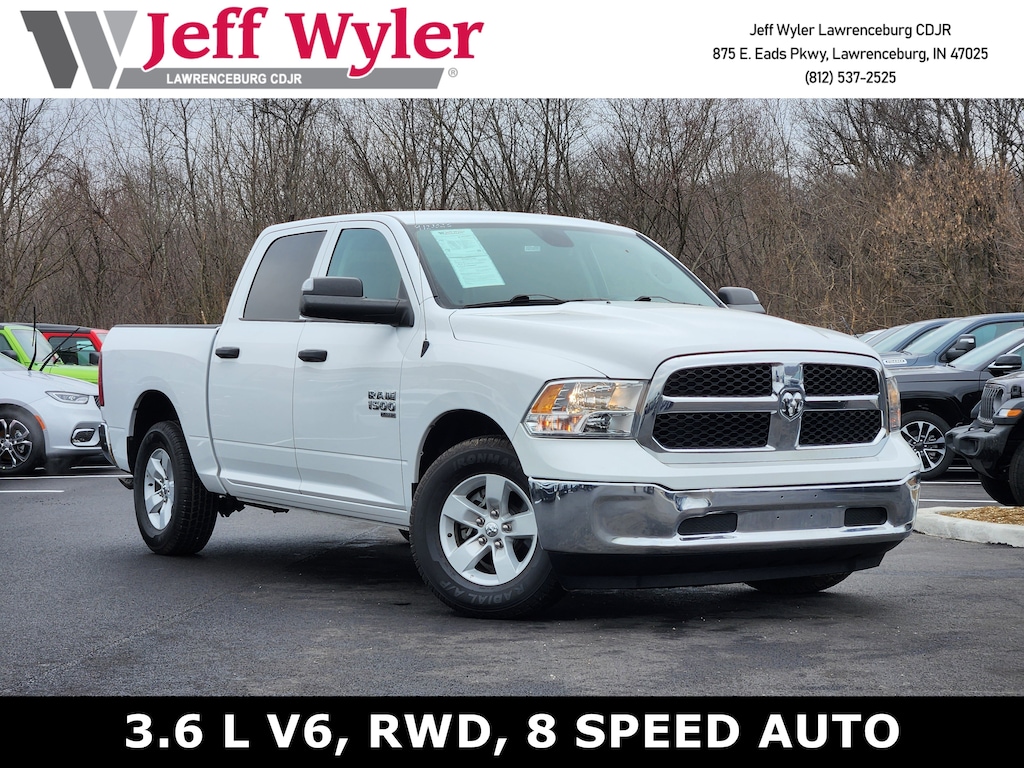 Jeff Wyler Chrysler Dodge Jeep of Lawrenceburg is very proud to offer this charming 2023 Ram 1500 Classic SLT in Bright White Clearcoat. Electronics Group (1 Year Trial (Registration Required), 4G LTE Wi-Fi Hot Spot, 8.4" Touchscreen Display, Air Conditioning ATC w/Dual Zone Control, Apple CarPlay, Audio Input Jack for Mobile Devices, Auto-Dimming Rear-View Mirror, Cluster 7.0" TFT Color Display, For Details Visit DriveUconnect.com, Global Telematics Box Module (TBM), Google Android Auto, Humidity Sensor, Integrated Center Stack Radio, Integrated Voice Command w/Bluetooth, Media Hub (2 USB, AUX), Radio: Uconnect 5 W w/8.4" Display, SiriusXM Guardian - Included Trial (B), and USB Host Flip), Quick Order Package 29G SLT, Trailer & Traction Group (Anti-Spin Differential Rear Axle, Black Exterior Mirrors, Class IV Receiver Hitch, Exterior Mirrors Courtesy Lamps, Exterior Mirrors w/Heating Element, Exterior Mirrors w/Supplemental Signals, Power Black Trailer Tow Mirrors, Trailer Brake Control, and Trailer Tow Mirrors), Trailer Tow Group, 1-Yr SiriusXM Guardian Trial, 17" x 7" Aluminum Wheels, 4-Wheel Disc Brakes, 40/20/40 Split Bench Seat, 5-Year SiriusXM Traffic Service, 5-Year SiriusXM Travel Link Service, 6 Speakers, ABS brakes, Active Grille Shutters, Air Conditioning, All Radio Equipped Vehicles, All VP4R Radios, Alloy wheels, AM/FM radio: SiriusXM, Brake assist, Bumpers: chrome, Center Hub, Cloth 40/20/40 Bench Seat, Compass, Delay-off headlights, Driver door bin, Dual front impact airbags, Dual front side impact airbags, Electronic Shift, Electronic Stability Control, Front anti-roll bar, Front Armrest w/3 Cupholders, Front Center Armrest w/Storage, Front License Plate Bracket, Front reading lights, Front wheel independent suspension, Fully automatic headlights, GPS Antenna Input, GPS Navigation, HD Radio, Heated door mirrors, Illuminated entry, Low tire pressure warning, Manufacturer's Statement of Origin, Occupant sensing airbag, Outside temperature display, Overhead airbag, Overhead console, Panic alarm, ParkView Rear Back-Up Camera, Passenger door bin, Passenger vanity mirror, Power door mirrors, Power steering, Power windows, Radio data system, Radio: Uconnect 3 w/5" Display, Radio: Uconnect 4C Nav w/8.4" Display, Rear anti-roll bar, Rear seat center armrest, Rear step bumper, Rear Window Defroster, Remote keyless entry, Remote USB Port, Remote USB Port - Charge Only, Rotary Shifter-Black, SiriusXM Traffic Plus, SiriusXM Travel Link, Speed control, Storage Tray, Tachometer, Tilt steering wheel, Tip Start, Traction control, Trip computer, Variably intermittent wipers, and Voltmeter Our PRE-OWNED vehicles are put through a rigorous 167- POINT QUALITY ASSURANCE INSPECTION along with an average amount of over $1,400.00 SPENT to recondition each vehicle so we can be sure to deliver you the highest quality vehicle like you deserve! ***ONLINE PRICE DOES NOT INCLUDE WYLER FAMILY FIRST PACKAGE*** Stop by 4136 Shelbyville Road to see for yourself, or give us a call @ 502-897-3151 to schedule your test drive! Ask about available certifications.
